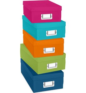 These Plastic Organizer Boxes are great plastic storage boxes that offer a functional and colorful way to store documents photographs magazines and more. These organizer boxes feature a lid and convenient label holder to help identify contents and are sold as a set of five boxes which includes one box in each color: lime sky blue navy blue orange and pink. Plastic Organizer Box Set Features Great for storing photos magazines important documents and much more. Color code your storage for convenient organization. Small label holders on the front of each box. Durable polypropylene plastic construction. Easy assembly.